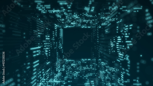 © estar 2020, Fototapeta premium Cyber tunnel consisting of moving glowing points. Futuristic infinite space background. Concept of data transfer in cyberspace. Hi-tech illustration. 3d rendering.