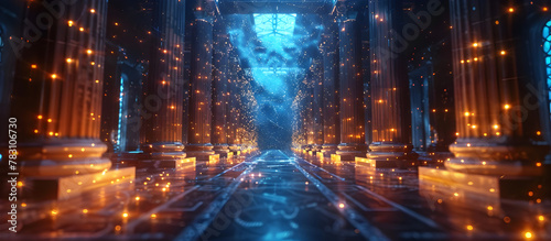 © Mayuree, Fototapeta premium Cybernetic Courtroom Trials Conducted by Algorithmic Intelligences in a Futuristic Blue Sci Fi Hallway