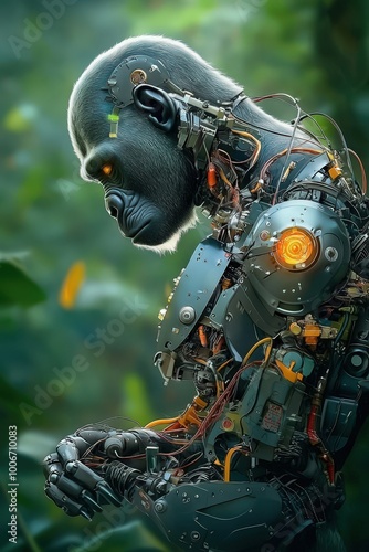 Fototapeta premium Cybernetic Gorilla in a Lush Green Environment