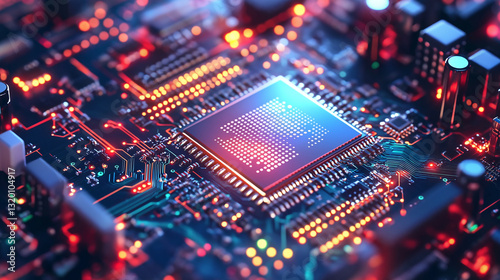 Fototapeta premium Cybernetic Heart: A close-up view of a sophisticated computer processor, the central nervous system of technology, glowing with intricate circuits and microchips