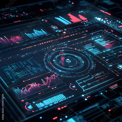 © Atirut, Fototapeta premium Cybernetic Interface: Digital display showcasing complex data visualizations with vibrant red and blue neon light, representing a modern interface.