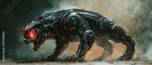 Fototapeta premium Cybernetic Panther: A Powerful Robotic Big Cat Stalking in the Dust