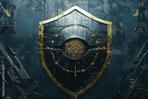 Naklejka premium Cybernetic shield design with robotic eye illustrates AI influence in...
