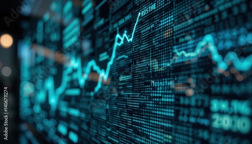 © Khamdani, Obraz premium Cybernetic Teal Data Stream: Ascending Market Trend Visualization