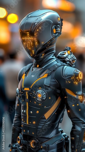 Naklejka premium Cybernetic warrior in a dystopian cityscape, advanced technology suit, sci-fi...