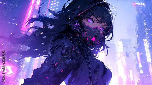 Obraz premium Cyberpunk anime character. Cyborg warrior ninja girl, intense look. Created...