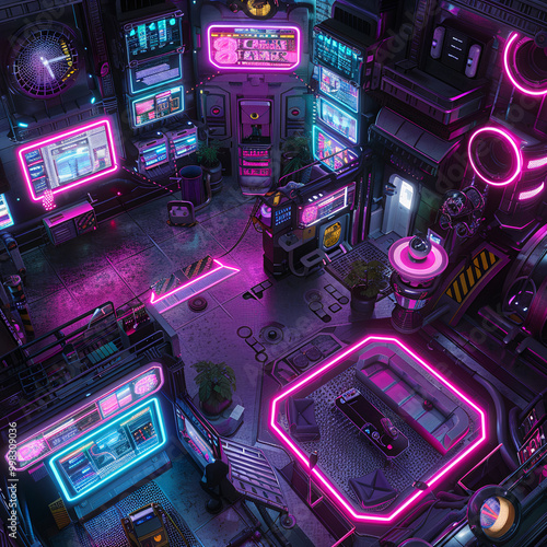 © Agnieszka, Fototapeta premium Cyberpunk Battle Map for DnD, Top-Down Tabletop Role-Playing Game Map, Futuristic Adventure Game Background, Virtual Tabletop RPG Asset for Sci-Fi Cityscapes and Urban Environments, High-Resolution Di