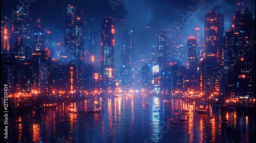 Fototapeta premium Cyberpunk City Nightscape, Rain, River, Boats, Future