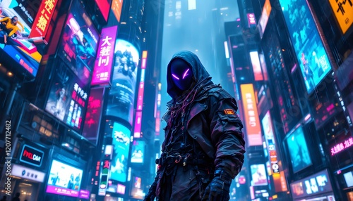 Fototapeta premium Cyberpunk City Rain: Neon-lit Streets and a Mysterious Figure
