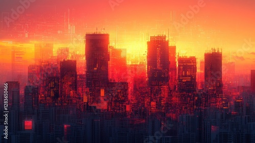 © khoerul, Fototapeta premium Cyberpunk city skyline at sunset. Possible use Digital art stock photo