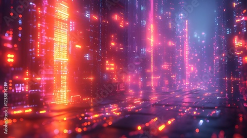Fototapeta premium Cyberpunk city street, neon lights, digital rain, futuristic alley,...