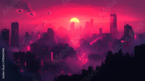 © banyu bening, Fototapeta premium Cyberpunk city sunset, flying vehicles, red sky