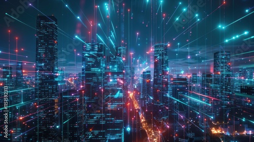 Naklejka premium Cyberpunk Cityscape: A Digital Tapestry of Light and Connection
