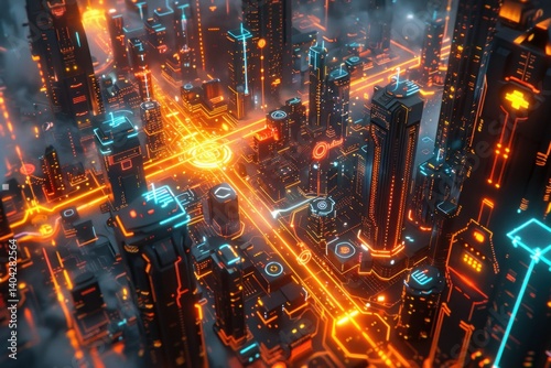 © Fitriaa, Fototapeta premium Cyberpunk Cityscape: A Futuristic Metropolis