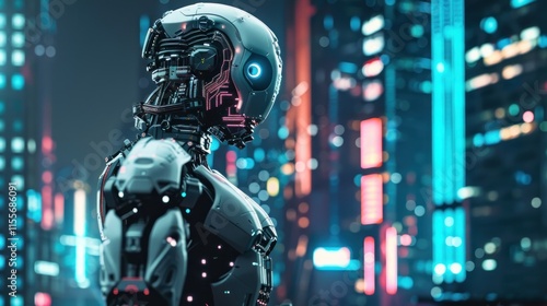 Naklejka premium Cyberpunk Cityscape: Advanced Robot in Neon Metropolis