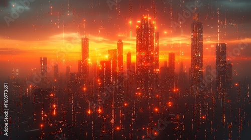 Obraz premium Cyberpunk Cityscape at Sunset: A Digital Metropolis
