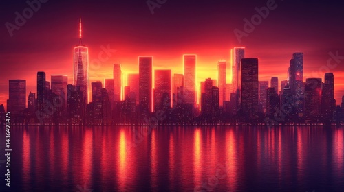 © lek Rinto, Fototapeta premium Cyberpunk Cityscape at Sunset: A Futuristic Metropolis Reflecting in Calm Waters