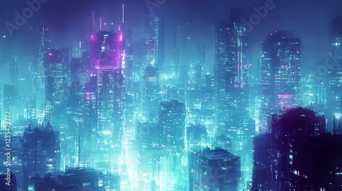 © heinng, Fototapeta premium Cyberpunk Cityscape Glowing Vividly at Night. AI Generated