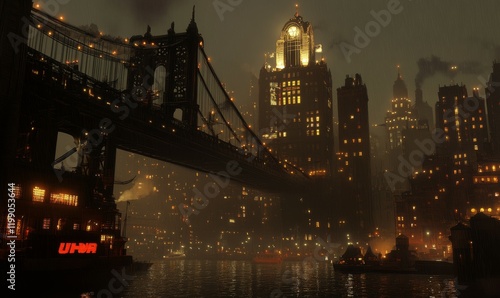 © Valentyna, Obraz premium Cyberpunk Cityscape with Bridge and Illuminated Skyscrapers