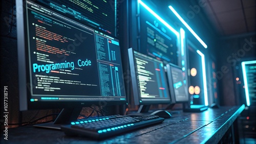 Obraz premium Cyberpunk Coding with neon lights, data visualization, and circuit patterns...