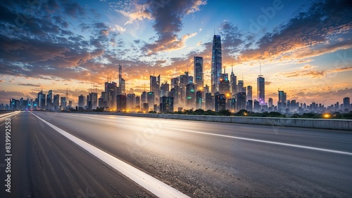 Fototapeta premium cyberpunk empty road against a cityscape High speed light effect Medium shot...