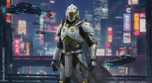 © Muchlis Nugroho, Naklejka premium Cyberpunk Knight: Futuristic Warrior in Neon Cityscape