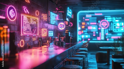 Obraz premium Cyberpunk Neon Bar: Futuristic Nightlife Scene