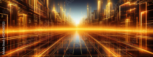 Obraz premium Cyberpunk Neon Grid Texture with Fiery Gold and Orange Glow"