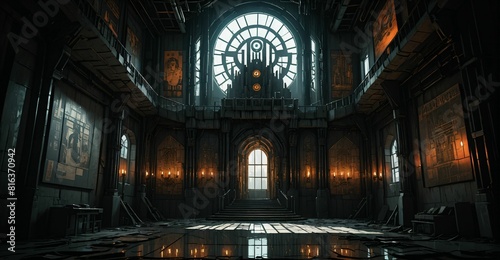 © Shane Sparrow, Obraz premium Cyberpunk palace ballroom room interior. Dystopian sci-fi castle empty room.