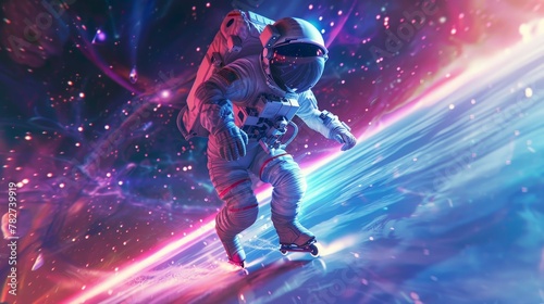 Fototapeta premium Cyberpunk photo of astronaut playing rollerblade colorful outta space