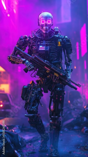 © Mas, Fototapeta premium Cyberpunk skeleton robot with rifle in a neon lit city