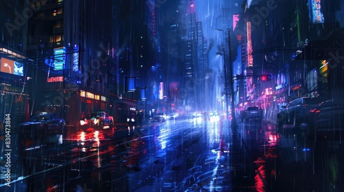 © Achmad Khoeron, Naklejka premium Cyberpunk streets illustration, futuristic city, dystoptic artwork at night, 4k wallpaper. Rain foggy, moody empty future