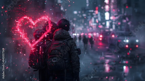 Fototapeta premium Cyberpunk Style, Amidst the chaos of doomsday, two hearts find serenity in...