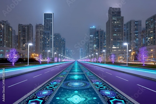 Fototapeta premium Cyberpunk-style Diwali with neon rangoli and electric diyas in a futuristic city