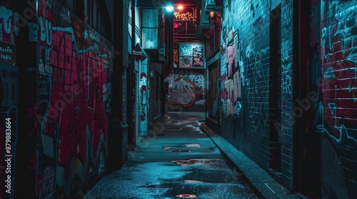 © hanafi 99d, Fototapeta premium Cyberpunk-themed graffiti on the walls of a dark alley