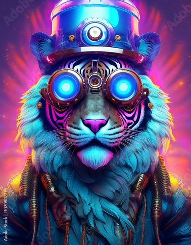 Fototapeta premium Cyberpunk tiger with huge glasses and futuristic steampunk hat in sci-fi dystopia style, high contrast, hyper realistic, fantasy, bright colors, neon, purple, pink, blue