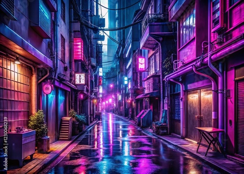 © Danicha, Fototapeta premium Cyberpunk Tokyo Night Alleys: 3D Anime Illustration, Magenta & Purple Neon Lights, High Depth of Field