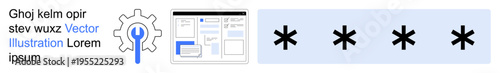 Fototapeta premium Cybersecurity, coding, web development, online privacy, programming, IT services. Gear icon, web interface and asterisks. Cybersecurity and web development topics