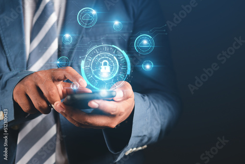 © Treecha, Fototapeta premium cybersecurity concept Business man shows how to protect cyber technology network from attack by hackers on the internet. Secure access to privacy through smartphones Meta protection.