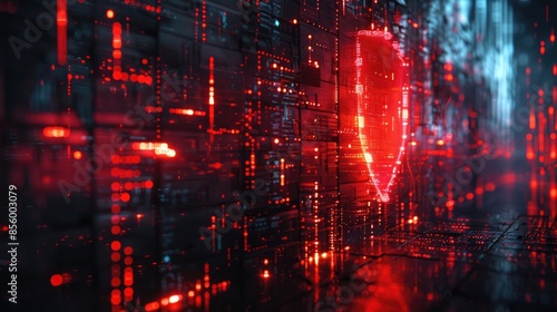 Fototapeta premium Cybersecurity Concept: Digital Shield, Encrypted Data, and High-Tech Environment