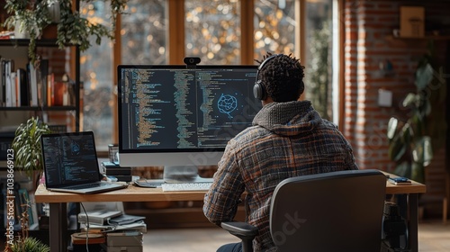 © SuriyaPhoto, Naklejka premium Cybersecurity concept of Programer sitting on desk discussing with mixed team of software developers about artificial intelligence innovation