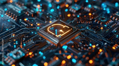 © jodoto, Fototapeta premium Cybersecurity Concept with Lock Icon on Circuit Board - High-tech illustration of a lock icon on a glowing circuit board, symbolizing cybersecurity and digital protection.