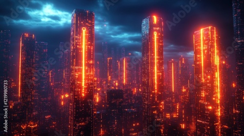 © zhuan, Fototapeta premium Cybersecurity Enhanced Futuristic Cityscape at Dusk with Skyscrapers and Neon Lights
