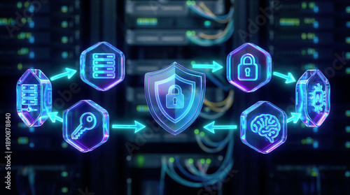 Fototapeta premium Cybersecurity icons with shield in data center server room
