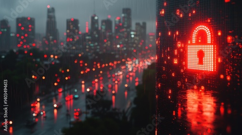Obraz premium Cybersecurity in the Rain: A City's Digital Fortress