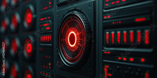 Fototapeta premium Cybersecurity ransomware concept. Futuristic control panel with glowing red circular interface and intricate circuitry.