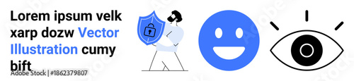 Fototapeta premium Cybersecurity, user privacy, online security, data protection, digital trust, surveillance awareness. Person holding shield with lock, happy face and eye icon. Cybersecurity and user privacy concept