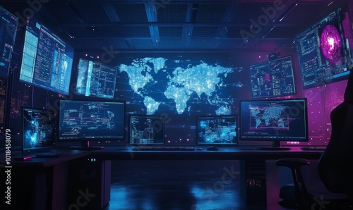 © jambulart, Fototapeta premium Cybersecurity workstation with glowing world map.
