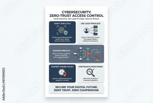 © Leo Rohmann, Obraz premium Cybersecurity Zero Trust Access Control Framework Ensuring Data Integrity Through Explicit Verification and Continuous Monitoring Against Breaches with Dynamic Risk Assessment Tools