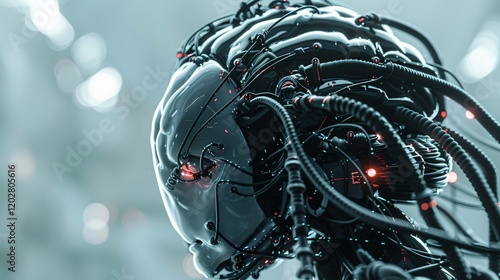 Fototapeta premium Cyborg brain with many cables, shiny ceramic surface, highly detailed